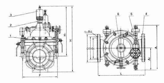 1、球阀2、导阀3、流量调节阀4、主阀5、压力表6、针阀